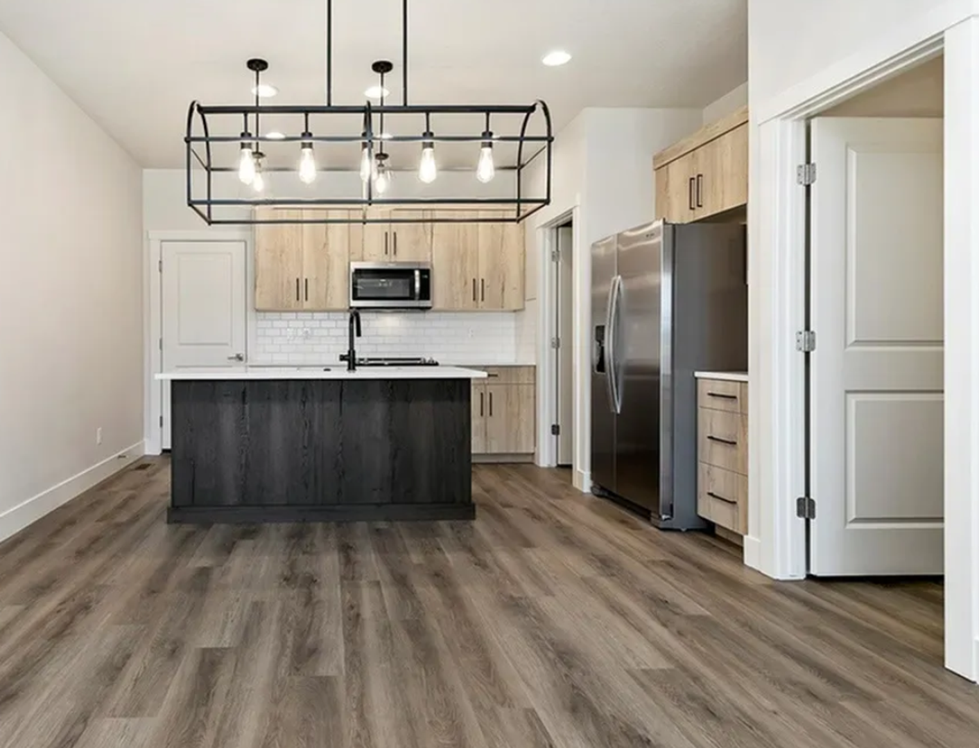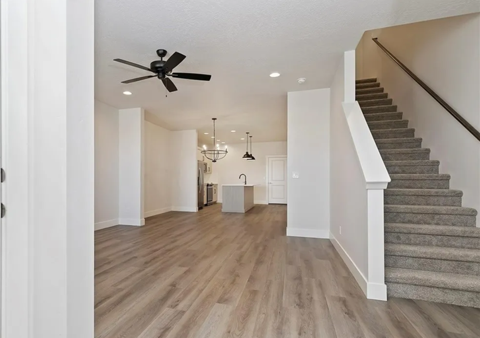 Home includes three bedrooms on the upper level and an open-concept main floor. These units also offer a main-level office. The entryway opens into the living area with clear sight lines to the modern kitchen. Upstairs, the primary suite includes a walk-in closet and an en-suite bathroom with dual vanities and a walk-in shower in most homes. Laundry is conveniently located near all the bedrooms.